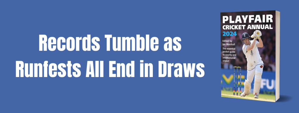 In the four matches in the division, 4672 runs were scored for the loss of just 90 wickets, an average of 51.91. Overall, that makes 10,666 runs scored this week and 223 wickets taken, at an average of 47.82. It was only the third time in history that all nine games in a round of Championship fixtures had been drawn, both previous occasions happening in September (1994 and 2019). Yet again, a change in how the season is organised has resulted in outcomes that haven’t really benefited the game as a whole, though the batters will certainly be enjoying the opportunity to enhance their averages. While the idea of making bowlers have to work harder for their wickets is well-intentioned, the outcome hasn’t been great. In my blog earlier in the month (‘Championship Run Rates’), I showed how bowlers in the First Division were averaging 30.78 in 2022 and 28.90 in 2023; this week in the First Division batters averaged 45.06, so the bowlers’ figures will be even worse when run outs are taken into consideration.